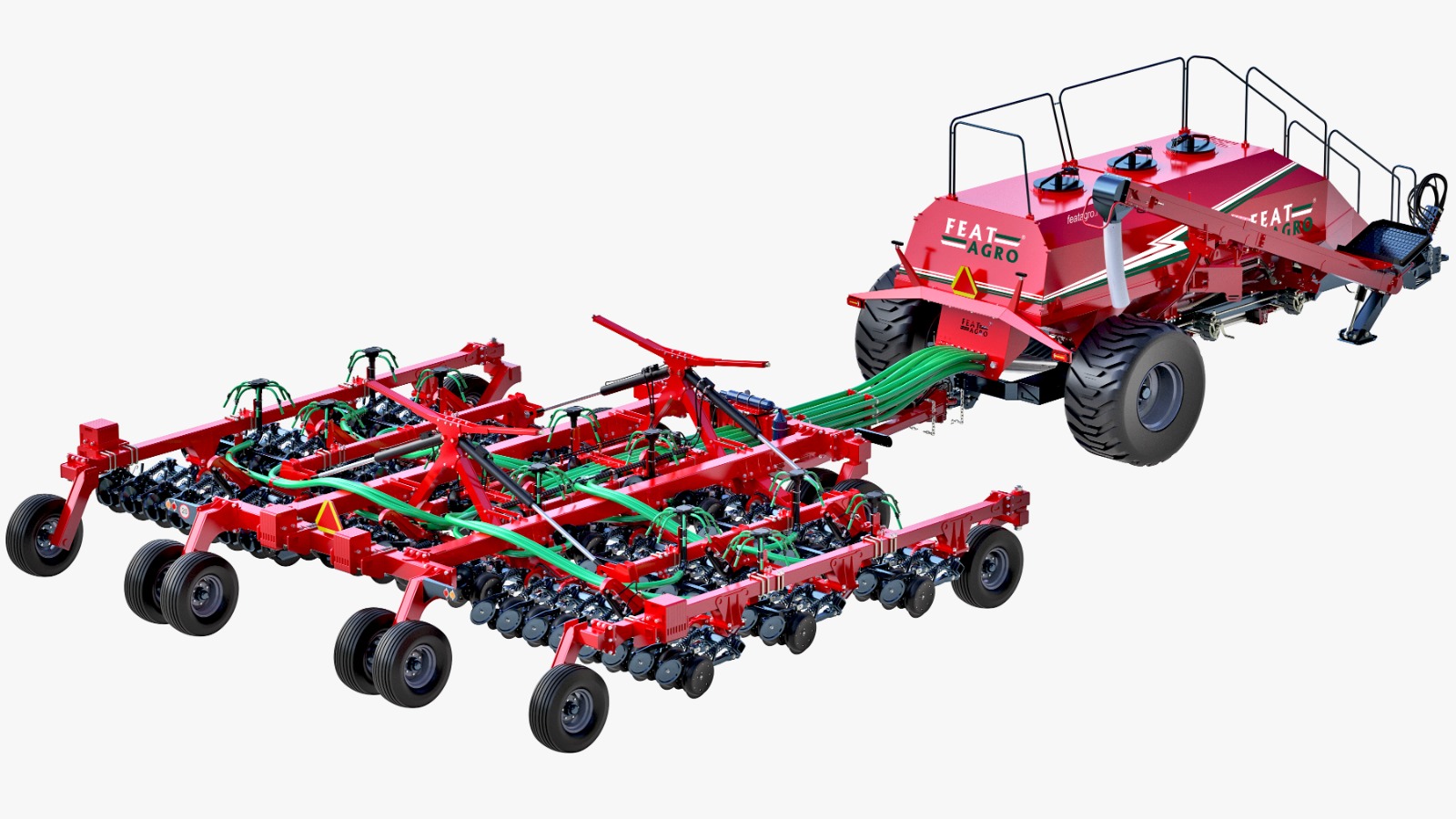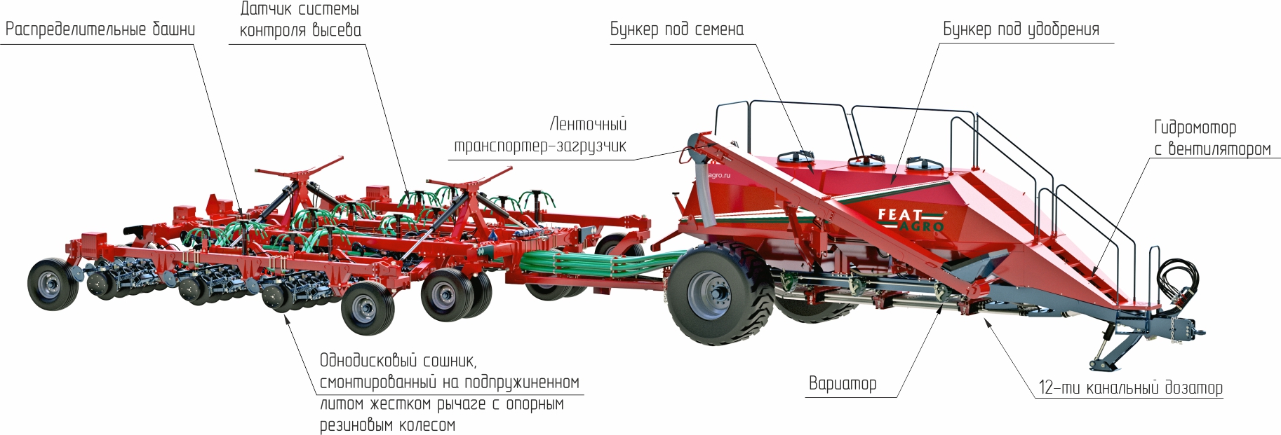 • Двенадцатиканальное распределение семенного потока (двухконтурное) позволяет вносить удобрения и посевной материал на разную глубину и использовать трехсекционный пневматический бункер с различными сериями посевных комплексов FEATAGRO