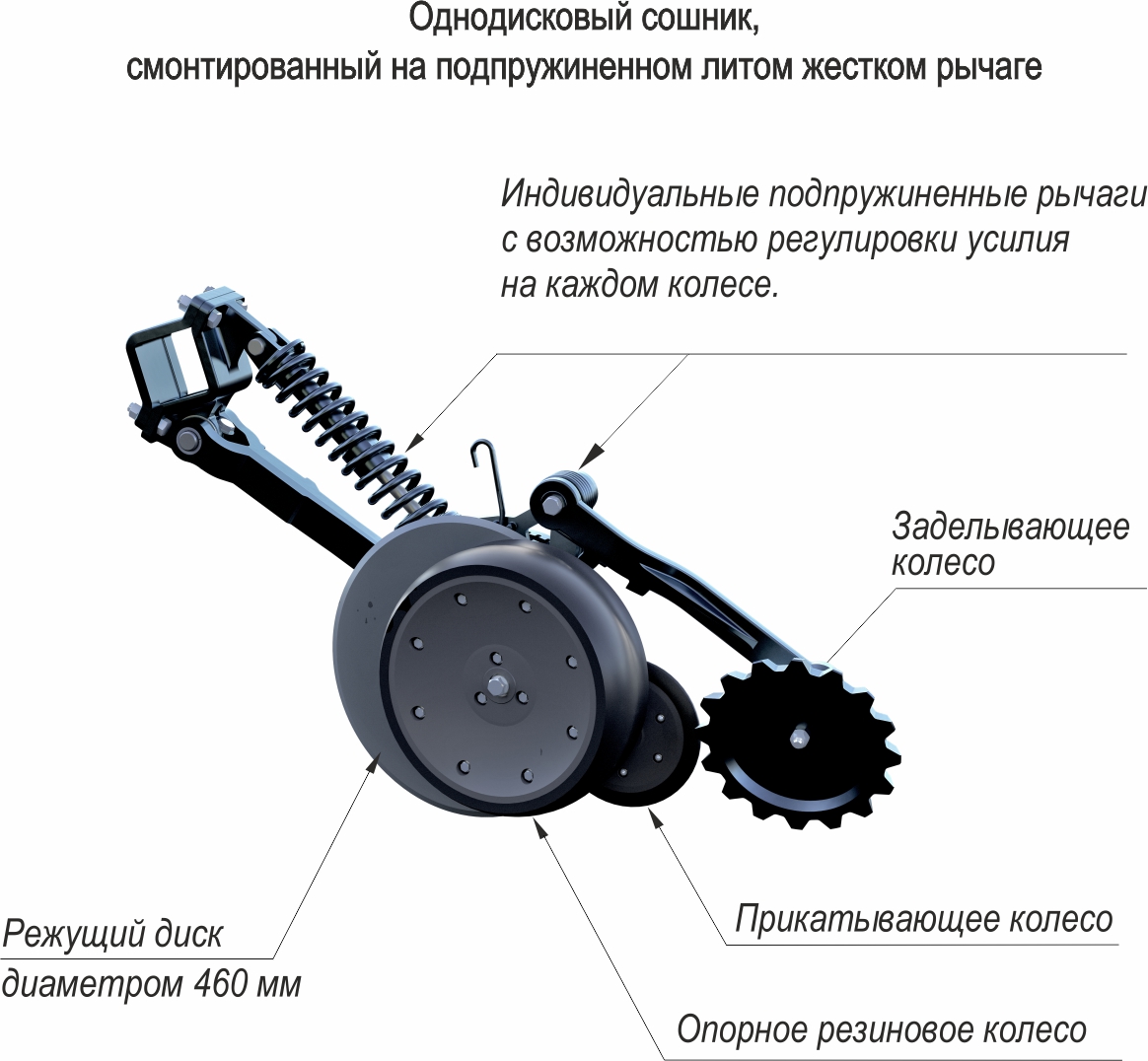 • Дисковые сошники (режущие диски) смонтированы на подпружиненном литом жестком рычаге с опорным резиновым колесом, что позволяет развивать усилие врезания до 210 кг;